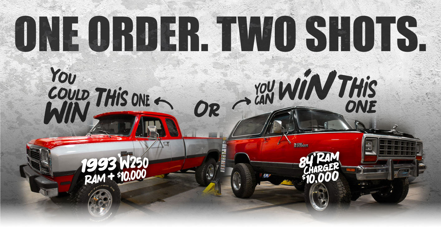 FFSG3 is officially live — and this one’s massive. Every order now enters you for two legendary Dodges: a fully built 1984 Ramcharger + $10,000 cash and a 1993 W250 + $10,000 cash. Two trucks. Two cash prizes. One shot.