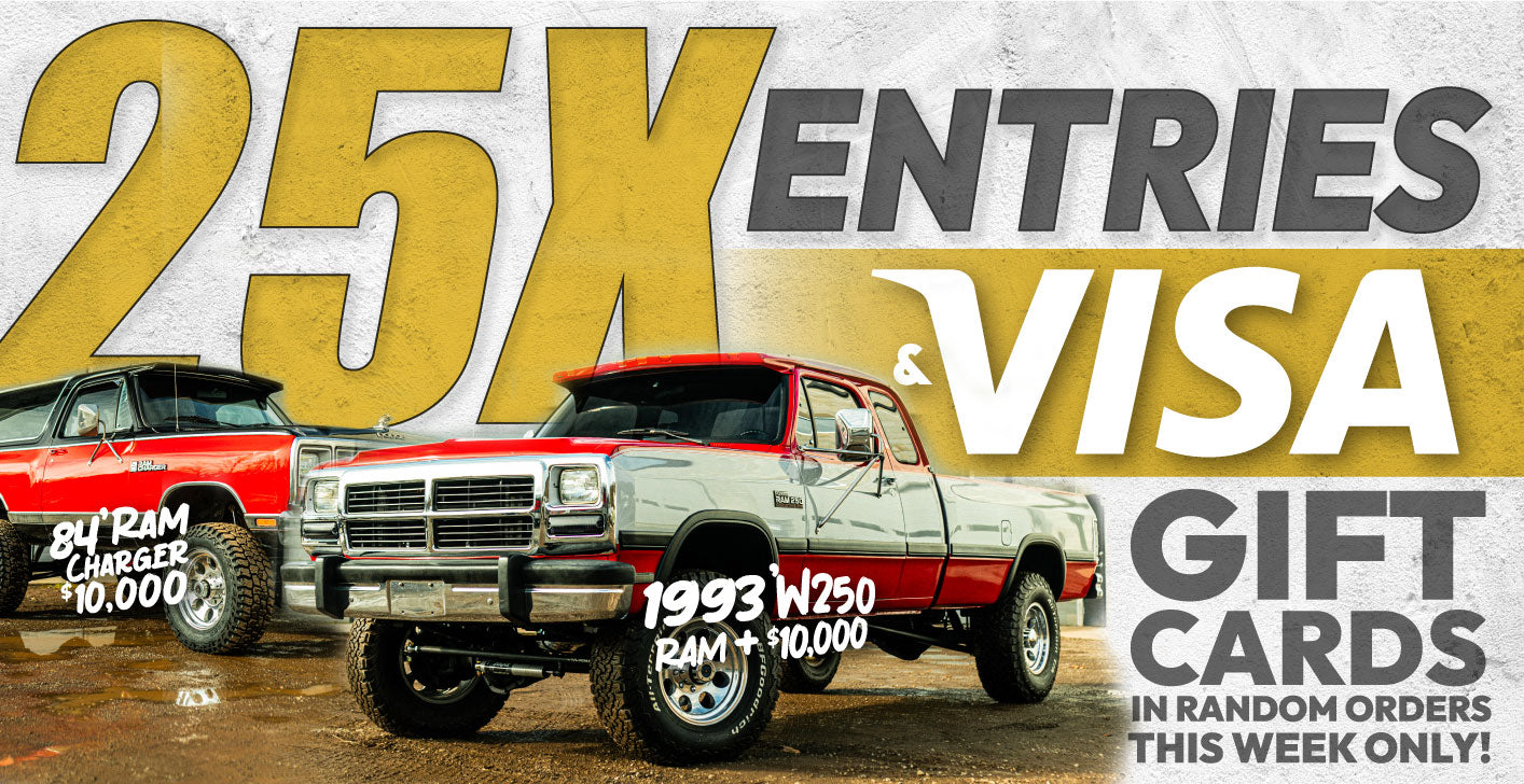 FFSG3 is officially live — and this one’s massive. Every order now enters you for two legendary Dodges: a fully built 1984 Ramcharger + $10,000 cash and a 1993 W250 + $10,000 cash. Two trucks. Two cash prizes. One shot.