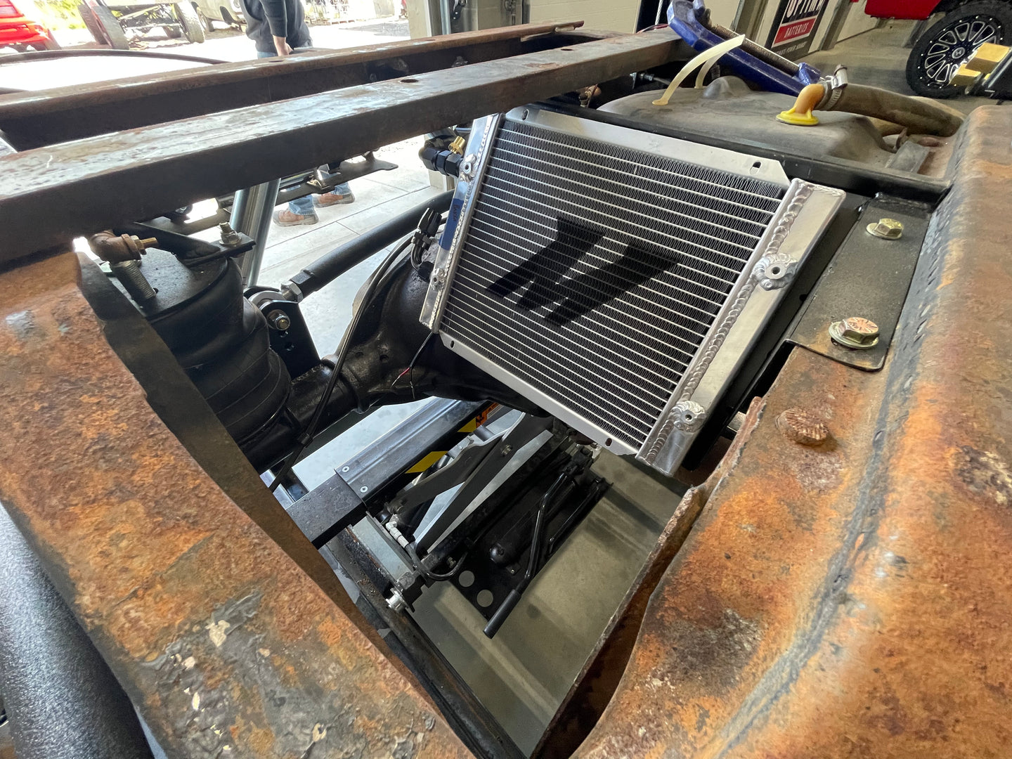 Includes a black powder coated steel bracket that extends forward from the rear shock crossmember to the next crossmember, holds one or two stacked coolers and fan and fan controller.