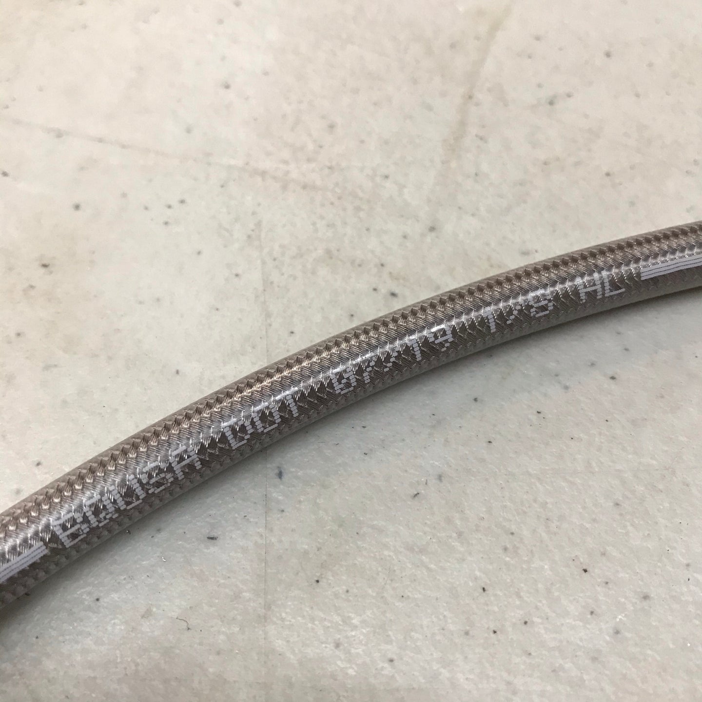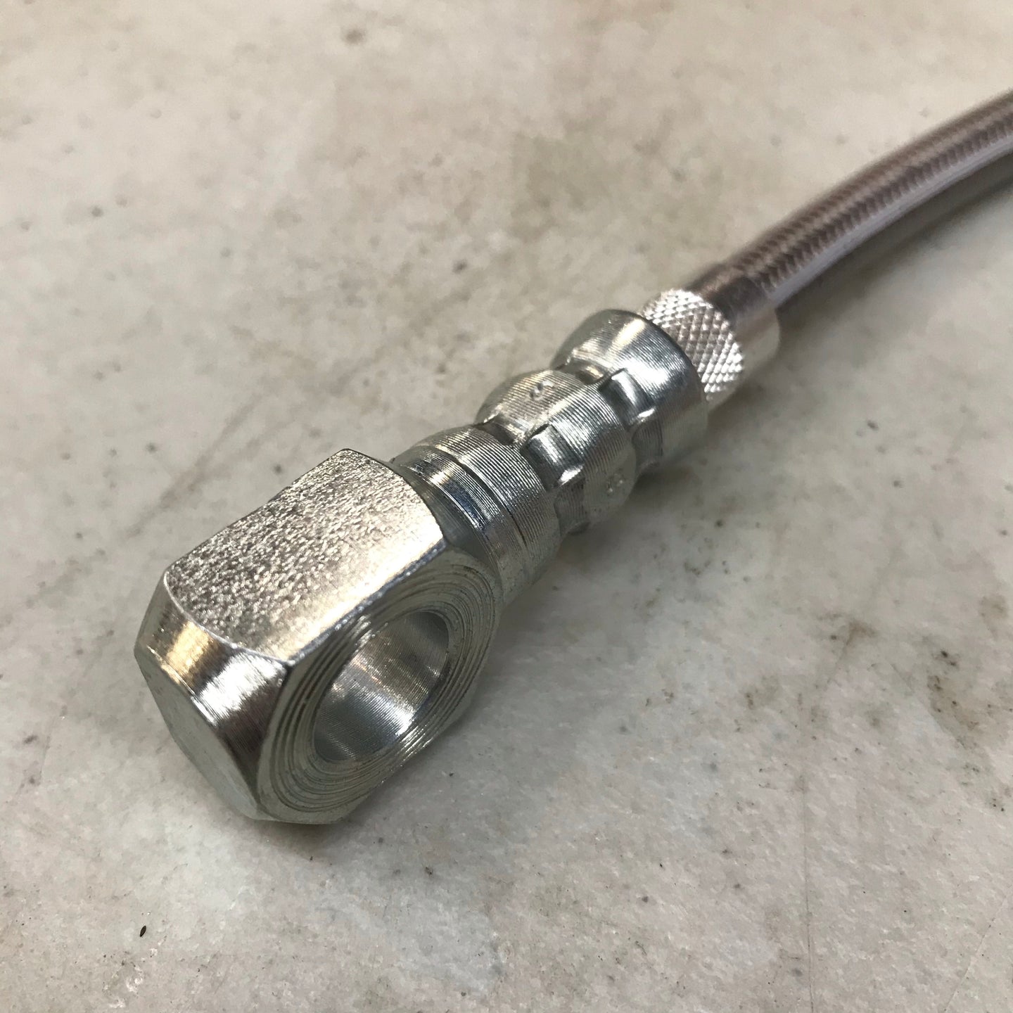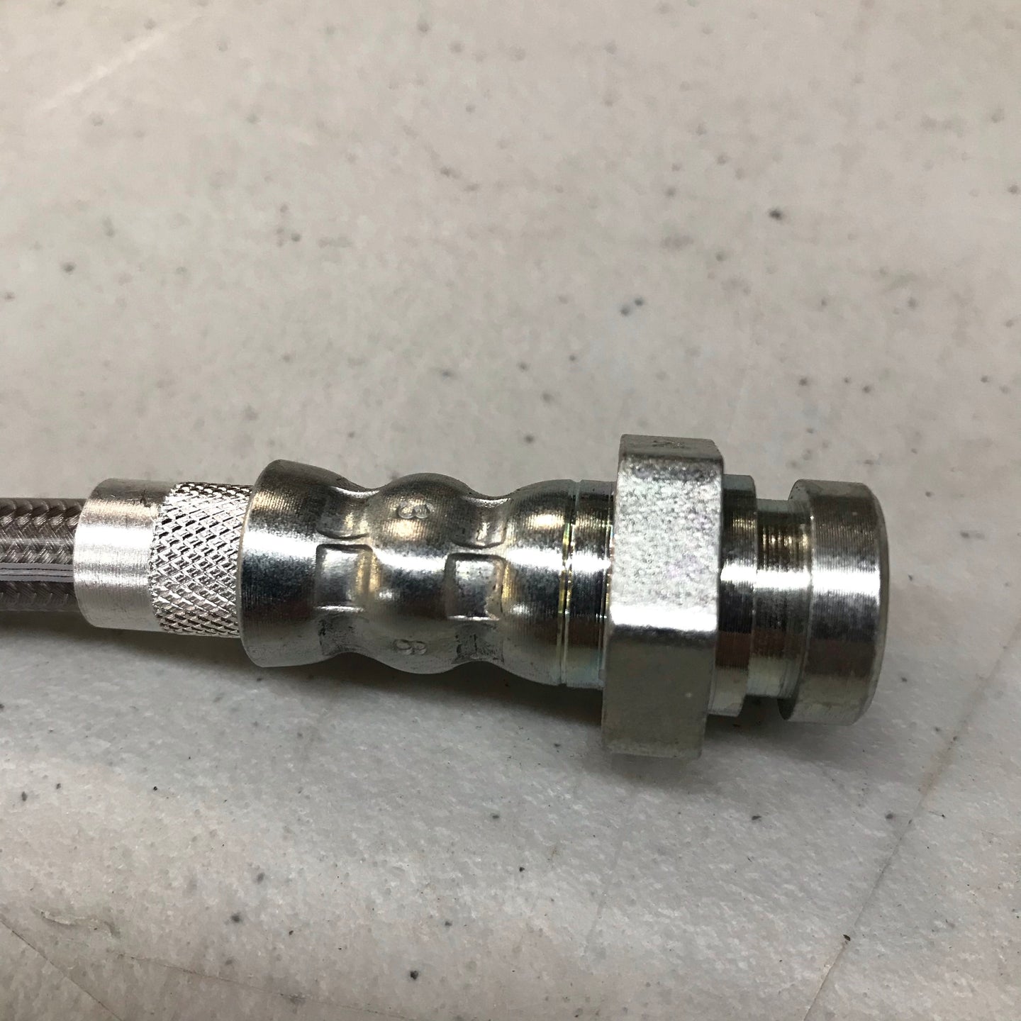 DOT approved stainless brake hoses for a 72-93 kingpin front Dana 60 at the knuckle / caliper. Pair. With tie down bracket to secure to the housing at the stock location. Mounting hole to axle housing may need enlarged for your existing mounting hardware.
