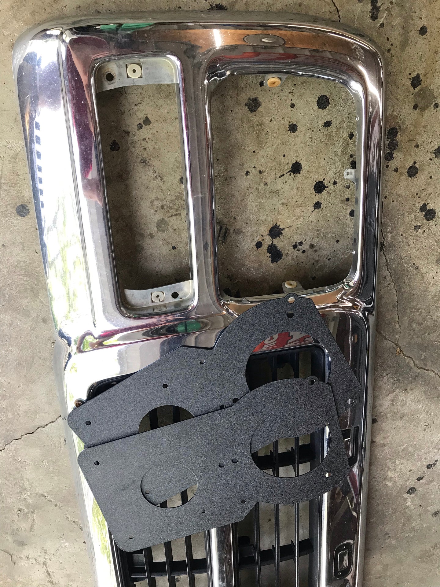 Want a newer grille on your older ram truck?? This is a relocation plate and headlight bucket mount as well as template for necessary mods to convert your earlier dodge to the 91-93 grille. Makes much more room for an Intercooler or other custom cooling package or just allows you to facelift from your current grille. Use the template to clearance some material from your older core support to allow proper wire pass through and drill a few new holes to attach the surface mount headlight buckets from the 91-93 truck. R/L pair. Driver side shown oriented correctly, passenger side would be a mirror image. We can usually supply the (click headlight buckets) if you don’t have any. We can usually also supply the (click lower valance) that fits between the bumper and grille. (No longer available NEW) We have new aftermarket grilles available as well as original or tinted marker lights.