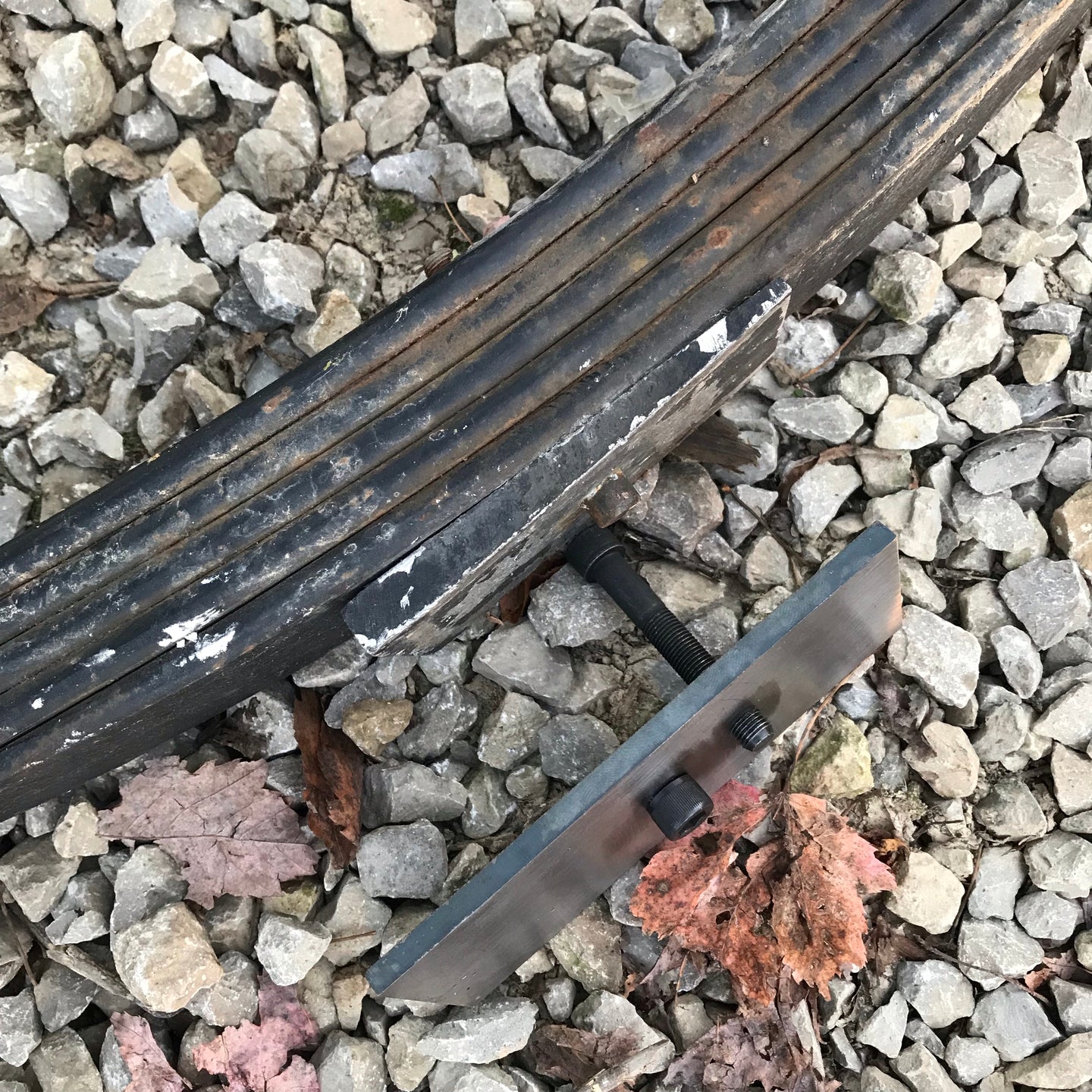 Bolt the new plate back in place with the new long center pin bolt extending down from the top of the leaf spring, with the new axle dowel pin 1” towards the front.